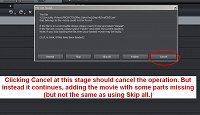 But it doesn't do so. Instead it continues, adding the movie with some parts missing. (They are not even the same as those using Skip all, another option I sometime use.)