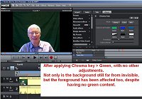 Then I used the webcam to make a test video, 640x480. But I was disappointed that using Chroma key > Green with MEP2013 gave very poor results. I played with Threshold and Fading Range wthout success. Either the background was not fully black or the foreground was spoiled.